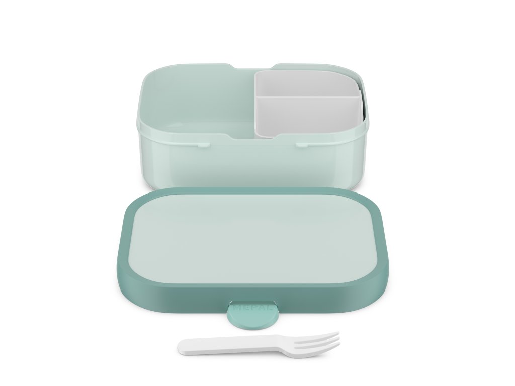 Praktický svačinový box s přihrádkami a vidličkou se snadným otvíráním klipem i pro menší děti. Ze zdravotně nezávadného plastu bez BPA.